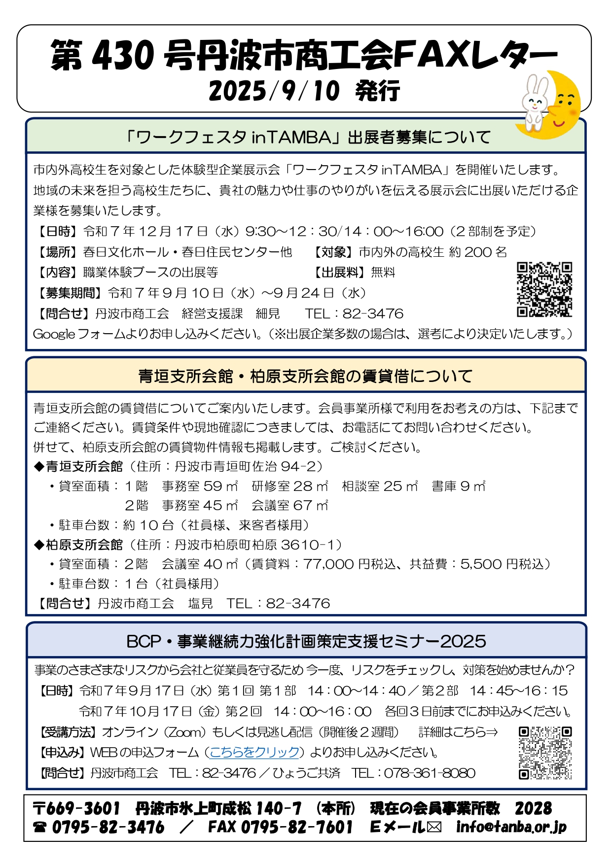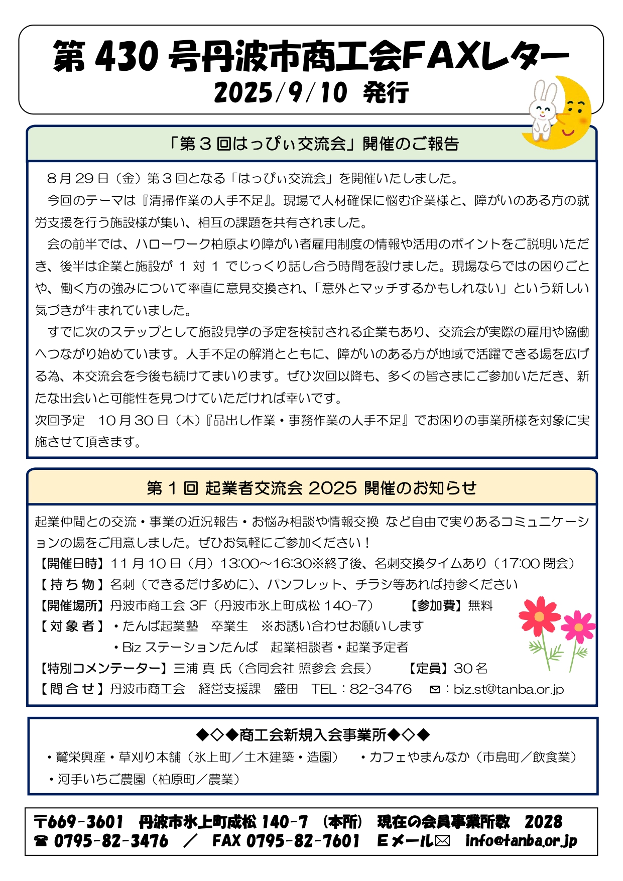 第430号FAXレター発行しました 2025.09.10 「ワークフェスタin TAMBA出展者募集」、「第3回はっぴぃ交流会開催のご報告」 および「第1回起業者交流会2025」等のご案内を掲載しております。 詳細に関しては、商工会または記載の連絡先までお問合せください。 印刷はこちら