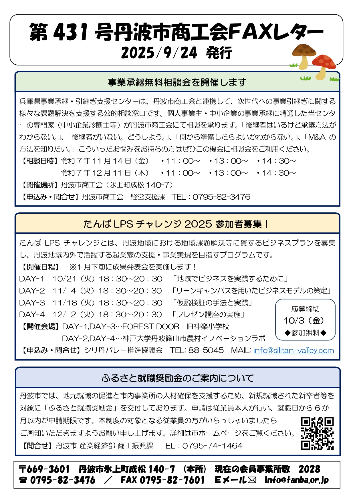 第431号FAXレター発行しました 2025.09.24 「事業承継無料相談会」、「たんばLPSチャレンジ2025 参加者募集」 および「第4回はっぴぃ交流会」等のご案内を掲載しております。 詳細に関しては、商工会または記載の連絡先までお問合せください。 印刷はこちら