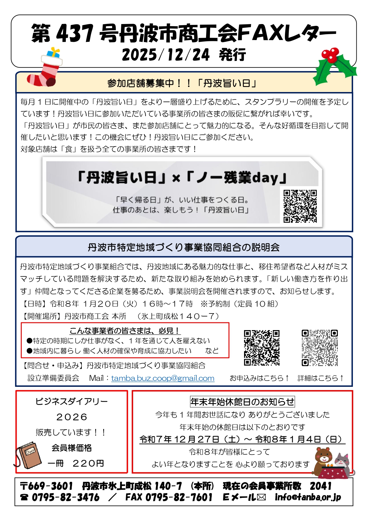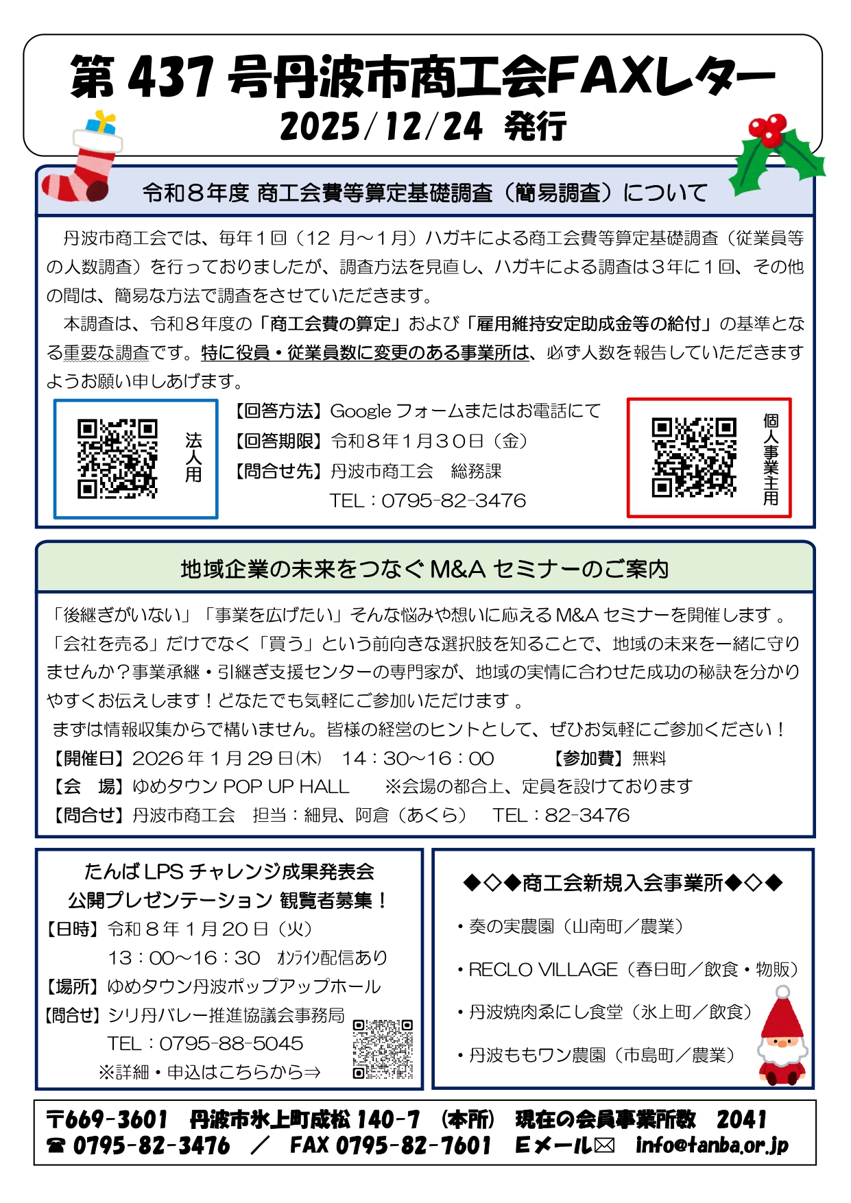 第437号FAXレター発行しました 2025.12.24 「令和8年度商工会費等算定基礎調査(簡易調査)について」および 「地域企業の未来をつなぐM&Aセミナーのご案内」等を掲載しております。 詳細に関しては、商工会または記載の連絡先までお問合せください。 印刷はこちら