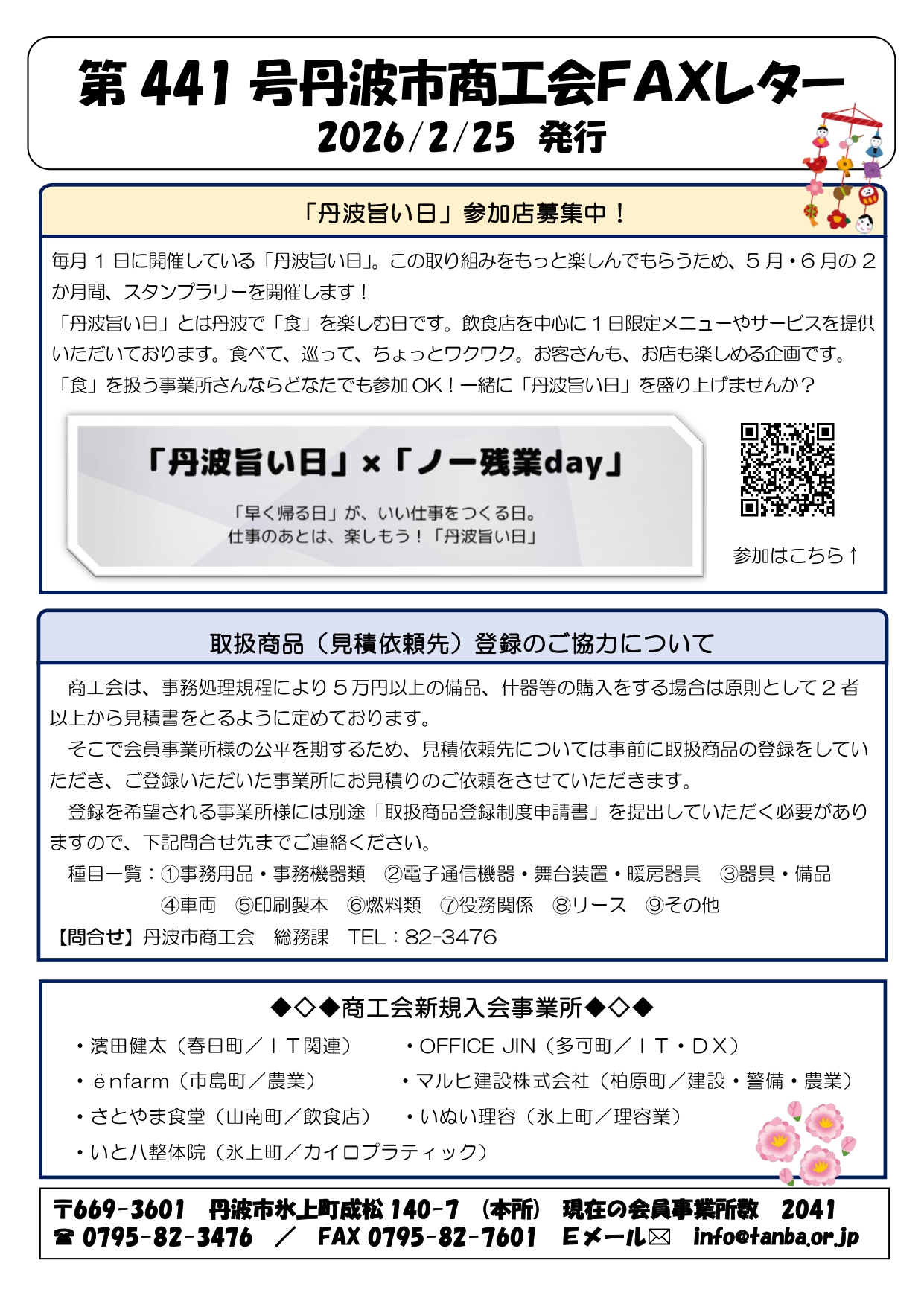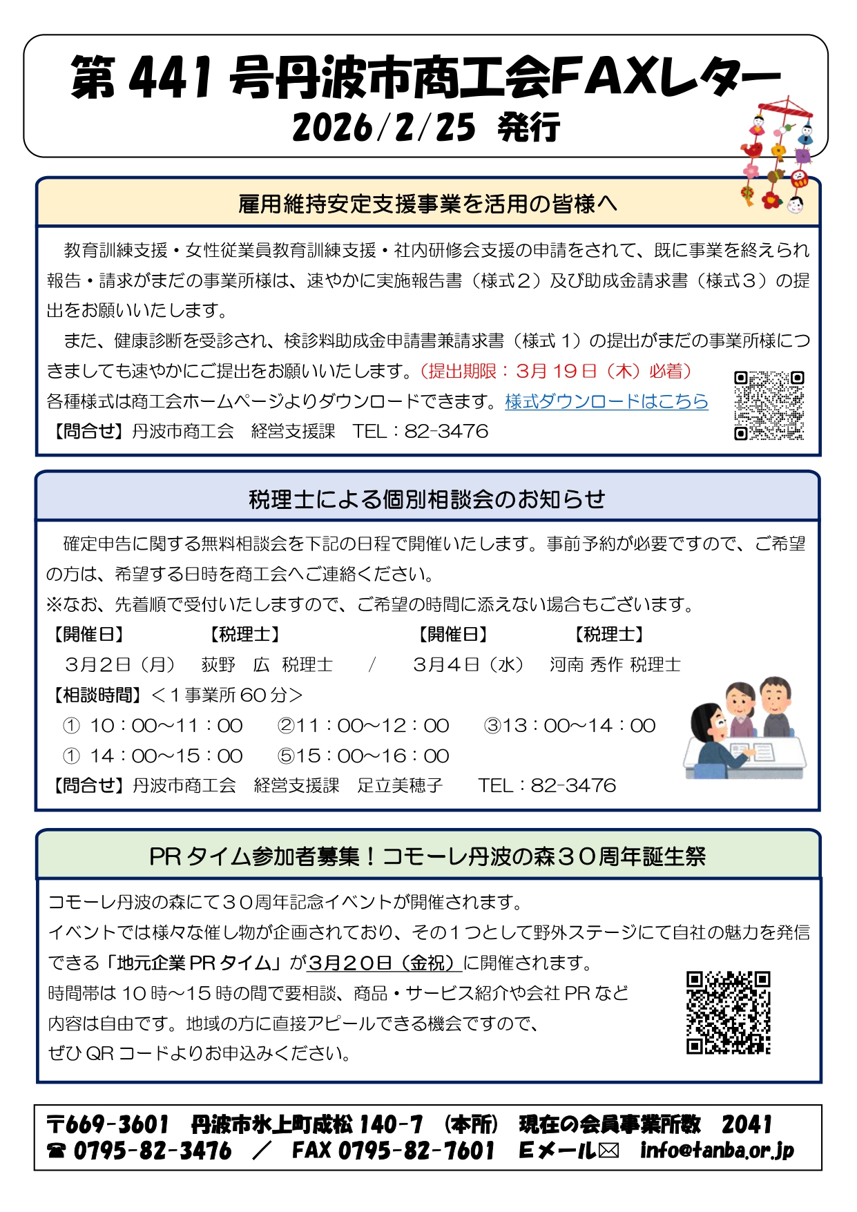 第441号FAXレター発行しました 2026.02.25 「雇用維持安定支援事業を活用の皆様へ」および 「取扱商品(見積依頼先)登録のご協力について」等のお知らせを掲載しております。 詳細に関しては、商工会または記載の連絡先までお問合せください。 印刷はこちら