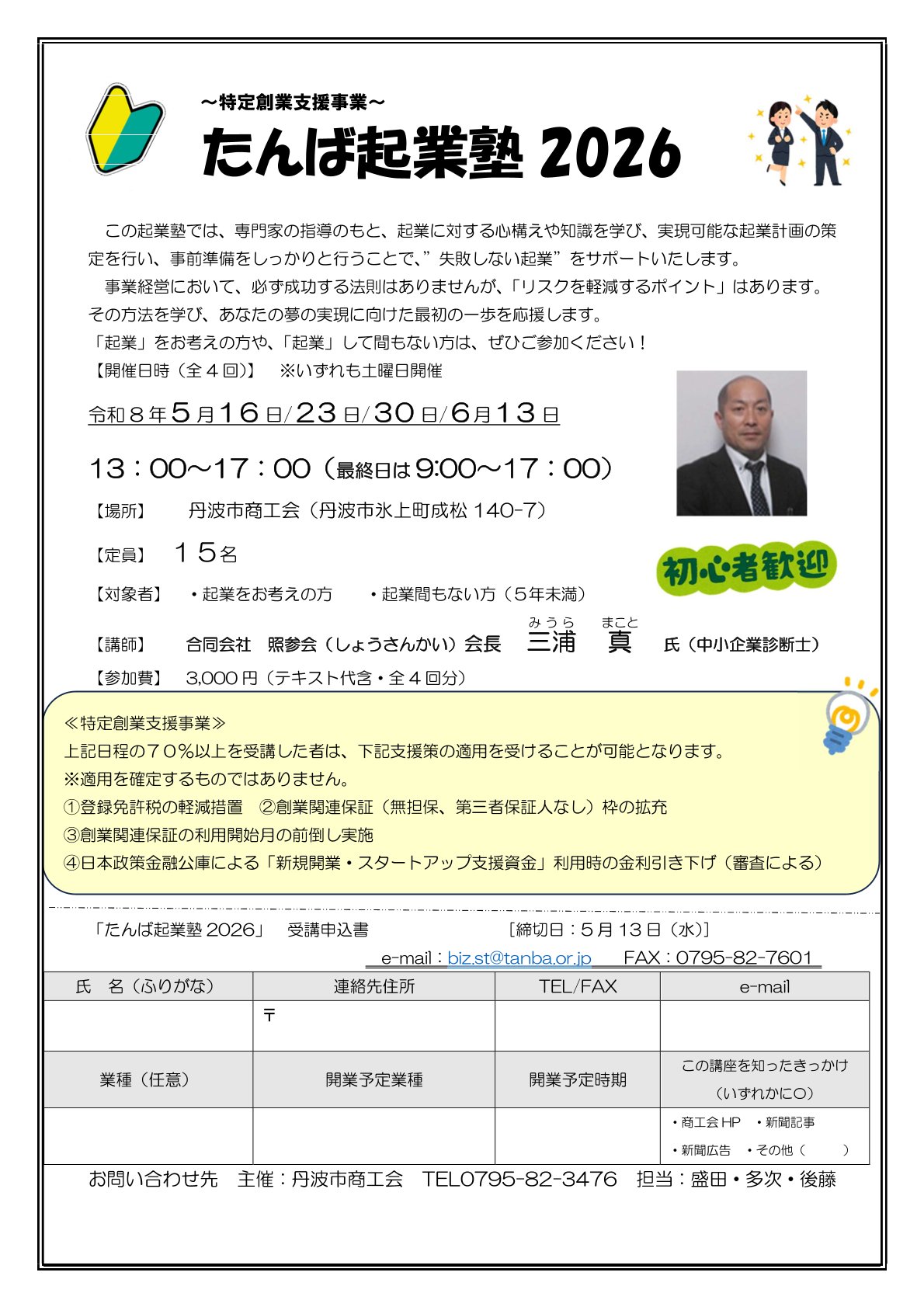 これから起業を考えている方、起業して間もない方を対象にした「たんば起業塾2026」のご案内です。