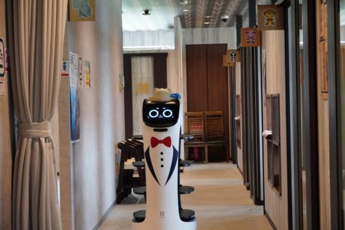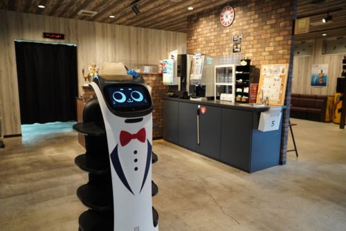 配膳ロボット「もぶにゃん」も活躍中。季節ごとに被り物をチェンジするおしゃれなロボットです。もぶにゃんの動きを見ているだけでも楽しくて、食事がますます盛り上がります。