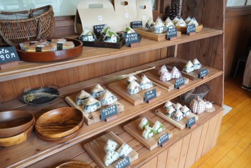 店内入り口近くが、「onigiri and…」の店舗スペースです。ステキな木製の棚に、かわいいおにぎりが並んでいます。「壁も友達と一緒に塗ったんです。本当にいろんな方に助けてもらってオープンすることができました。感謝しかありません」と話す芦田さん。