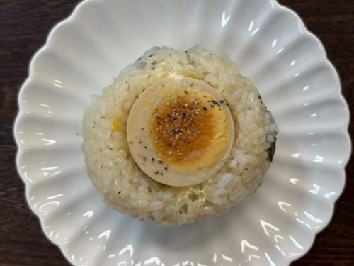 「煮たまご」は、ゆで卵を甘めの味付けにした煮卵を半分にカットし、ごはんと海苔で包んでいます。マヨネーズとの相性が抜群で、トッピングの黒コショウもアクセントになっています。