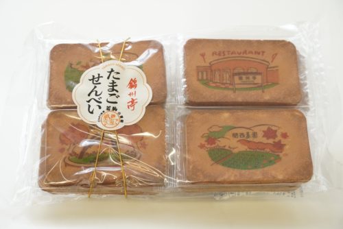 錦州亭オリジナルのお菓子「錦州亭たまごせんべい」も人気です。カラーの焼き印が入った、かたすぎずやわらかすぎずちょうどいいかたさの、素朴な味わいのおせんべいです。