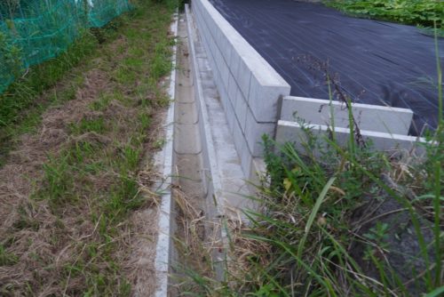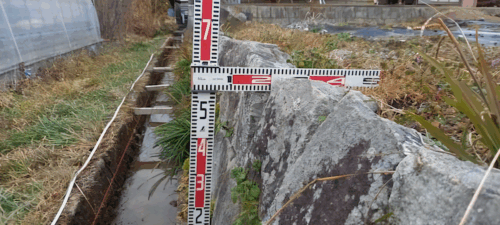この現場では、石をどかして壁を起こし、型枠を作りコンクリートを流し、水路の幅に入るサイズの製品を設置しました。