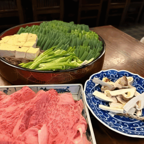 定番の「丹波牛すき焼きコース」は、丹波牛のメスのみを使用。地元だからこそ手に入る上質な肉を、砂糖と醤油でシンプルに味付けし、たっぷりの青ネギとともに味わいます。調理もおまかせできるので、鍋奉行をすることもなく、ゆっくりと味わうことができます。