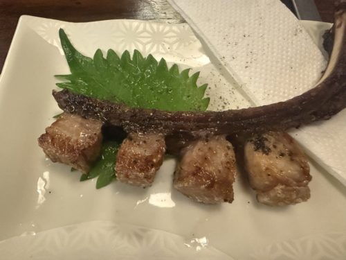 「猪のスペアリブ」も登場。骨にかぶりつくと、あっさりした脂の甘みをほどよい塩味が引き立て、思わず骨までしゃぶってしまうほど。ワイルドな見た目ながら、年配の人にも人気だというのがわかります。「川エビとサツマイモの唐揚げ」は、針のように細く切ったサツマイモとエビの組み合わせが絶妙!