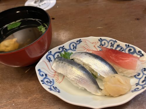 締めくくりは、前述のイワシを使った握り寿司で山椒味とワサビ味、そしてミョウガの握り。イワシの酢加減もちょうどよく、口いっぱいに旨みが広がります。最後のすまし汁は、鱧のアラで引いたダシ。体にすっと染み入るような、上品な一杯でした。