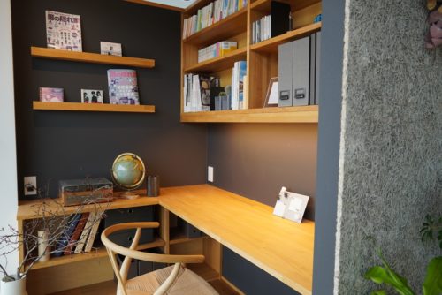その他の施工例として、作り付けの机と本棚を設けた2畳ほどの書斎スペースは、静かに読書や仕事に集中でき、ひとり時間を楽しめます。